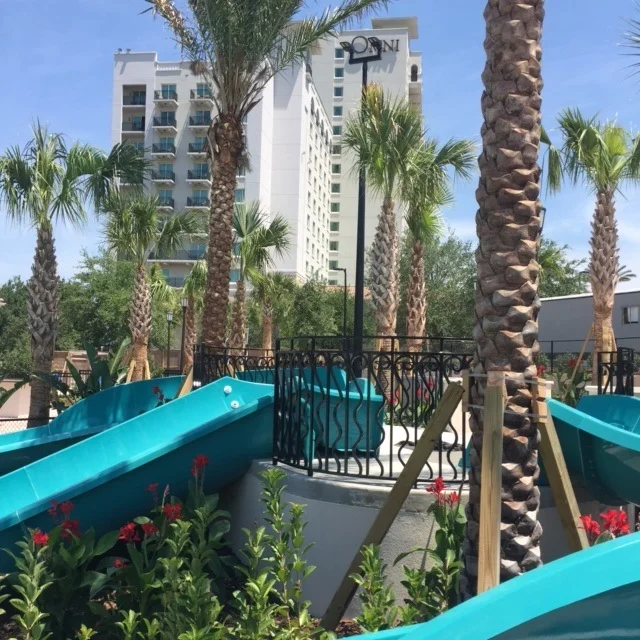 All Metals was contracted to install custom wrought iron hand rails, along with beautiful stainless steel posts for the decorative mesh around the water park at Westgate Plaza, Kissimmee, FL.